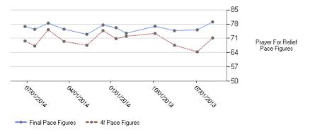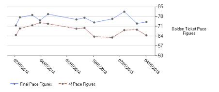 The one item to note in his Pace Figures is the three race CPT Pattern (Cyclical Pace Top). This designation of CPT is for older runners who hit its highest 4f Pace Figure over the course of 10 races. Looking back at his nine previous races, you can see a CPT comes every three races and has increased over the nine race period from 77 – 77.6 – 78.5.