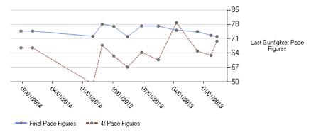 He shocked the racing world by winning the Grade 1 Travers (for 3-year-olds) in the summer of 2012 but has yet to get back to that Grade 1 level. His lifetime top was a 79.7 in March 2014, and he’s regressed in his final figure since then down to his most recent effort of 71.6, the slowest final figure of all the runners.