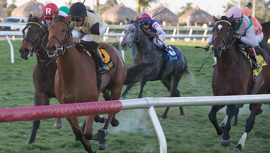 Sky Blazer had no lack of problems when he raced on Feb. 2 in an optional claimer at one mile on the turf at Gulfstream Park. Racing 10th in a field of 13 over a speed-favoring course, he was rallying 5-horses wide at the top of stretch when he had nowhere to run for a while. Once clear, Sky Blazer showed his class and determination when he kicked into gear again and rocketed from ninth to second in the final furlong, losing by three quarters of a length.