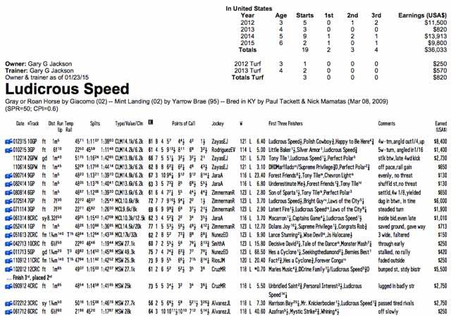 In five straight starts from Aug. 8 through Nov. 22 – all in $6,250 claiming races – Ludicrous Speed ran at a mile in each of them. He started near the back of the pack in all of them and then rallied without success. In the Nov. 22 start, he came the closest, finishing second, a length behind the winner. In those four other starts, Ludicrous Speed’s best effort came on Nov. 6, when he was fourth, beaten by 3 ½ lengths.