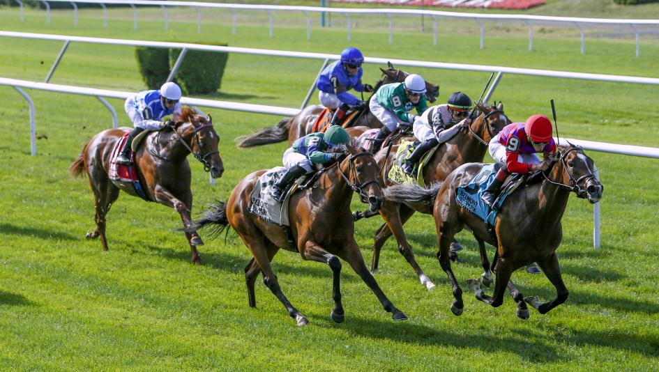 Horses race on the turf course at Belmont Park earlier this year. (Eclipse Sportswire)