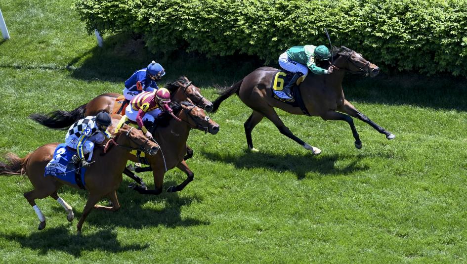 Horses race on the turf course at Churchill Downs. (Eclipse Sportswire)