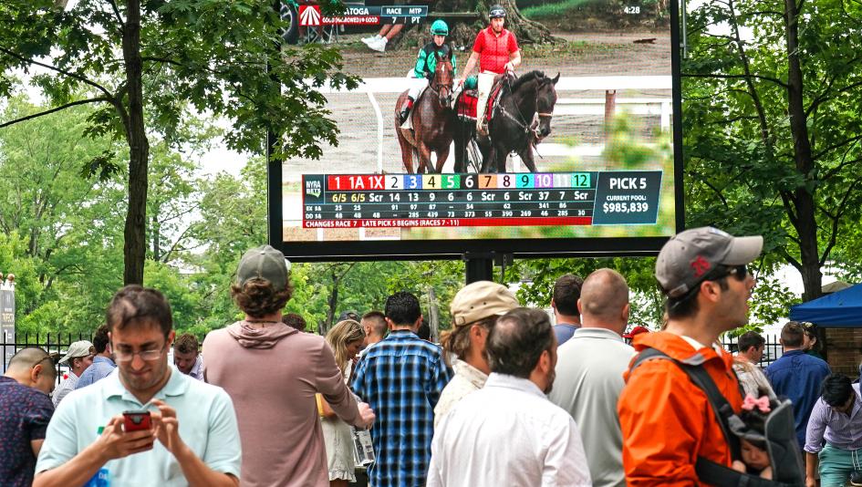 Bettors at Saratoga Race Course keep an eye on the odds on the big-screen television before a race at the 2021 meet. (Eclipse Sportswire)