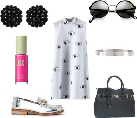 I love this pattern on this $27 Black Five dress, and the high neck and shift shape are Mod all the way. Your feet will thank you for the stylish silver $44 loafers from Missguided, and you can fit all of the money you’re saving in this chic tote for $42 from Go Jane. Shine on in a $25 bracelet from Armitage and accessorize the look with these fantastic button earrings for $12 from Overstock.com and $14 sunglasses from Trish. Add a coat or two of this $8 Pixie nail polish and you’re Breeders’ Cup-bound in an on-trend Mod look for just $172.