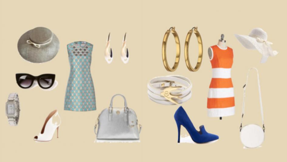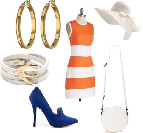The broad orange stripes (also a fall trend!) on this vintage-inspired dress ($140, ModCloth) are perfect for autumn in LA, and I added a beautiful high-heeled loafer for $90 from Shoemint. A round long-strap handbag ($50, NastyGal) recalls the ‘60s without getting too literal, and the white hat ($13, Deer Mum) keeps you in the spirit of the races. Gold hoops for $31 from LAUREN by Ralph Lauren and a pretty bracelet with a swallow charm ($95, MCQ by Aleander McQueen) finish off the ensemble, which comes to $419.
