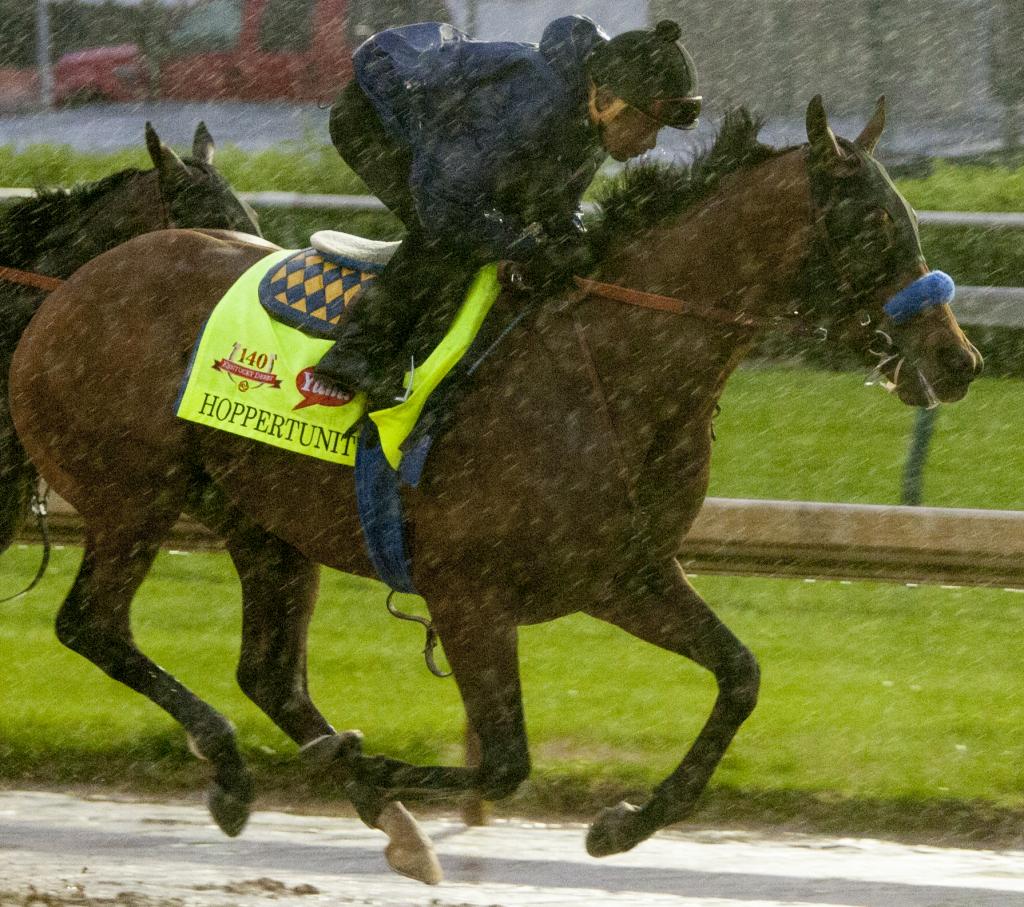 “I brought him out and he worked really well with Drill. Usually Drill wouldn't work well on this and today he did. He's a really good work horse. We gave him a little bit of a head start this time - the last time Drill went to the eighth pole and didn't want to work, but today he stayed with him. They work together all the time and what they did today was a normal work,” Baffert said. "It was a good work. I'm glad I got the work in. He [Hoppertunity] looked great. He was reaching out well. Got it in and got it out of the way. I can relax now, sit around and go buy my tickets."