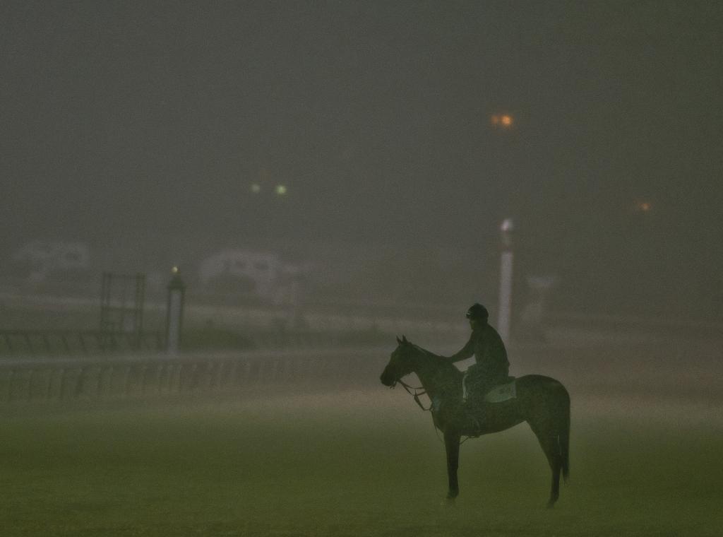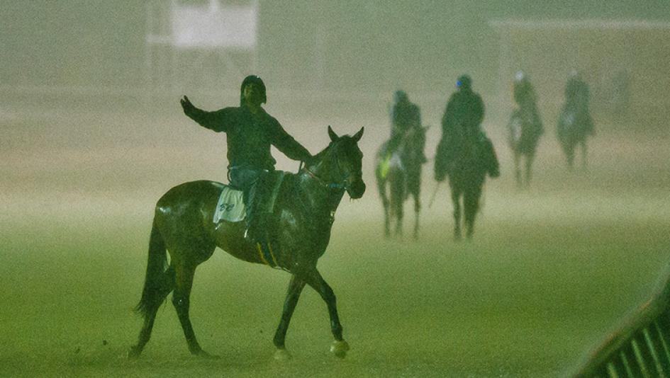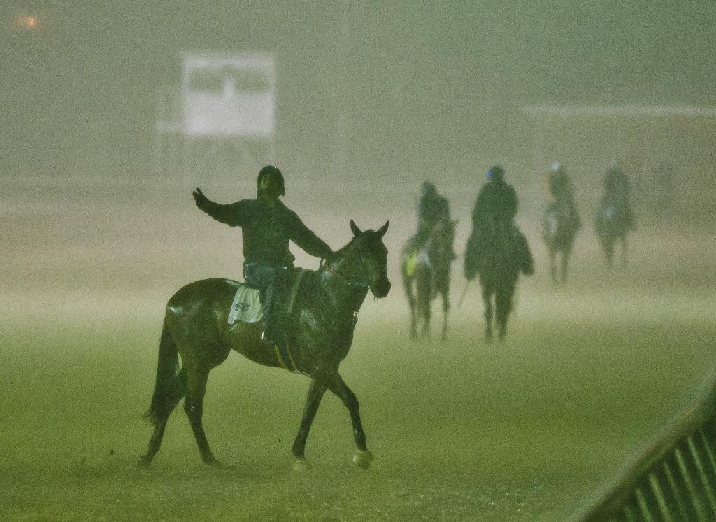 The track was closed for more than half an hour due to the weather but as soon as it opened, Hoppertunity was on the track and working. He didn’t seem to mind the condition of the track or the weather, working in company with stakes winner Drill in a time of 48 seconds flat.