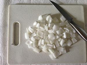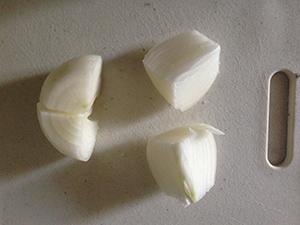 Slice both ends off the onion then slice it in half and then in half again. Then slice onion in into square chunks (about a quarter of an onion per sandwich works well. You want the onion to compliment not overwhelm).