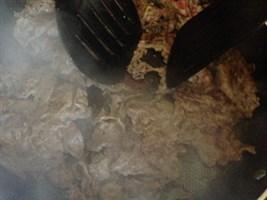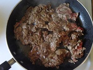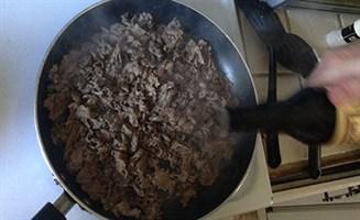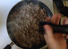 Start gently shredding the steak in the pan with a pair of spatulas until you’ve got the steak lightly shredded. At this point, start grinding fresh pepper liberally onto the steak and add kosher salt to taste into the pan while stirring. We’ve got a little salt grinder that works great. Then splash on a tablespoon of Worcestershire Sauce evenly and keep turning and flipping the steak in the frying pan. (Note: my wife likes the taste of onions but not the texture, so I also add a healthy sprinkle of onion powder to the steak for her.)