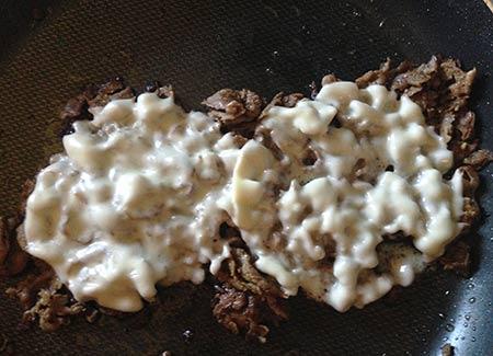 Reduce to low heat, add the cheese (American or Provolone) to the top of the steak and cover to melt. If you are using Whiz, just take the blend from the sauce pan and coat both the top and bottom halves of the roll.
