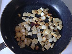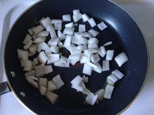 Drizzle just enough Olive Oil on the second pan to get a nice coat and start frying those onions. You want them to be nice and soft but not limp and overcooked, so keep flipping and stirring them. After about 5 to 7 minutes when they look like the image below, you can reduce the heat to very low and cover. You want to be able to devote all of your attention to the ribeye.