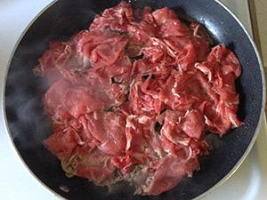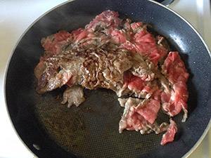 Drizzle Olive Oil on the frying pan and make sure the entire surface is very lightly coated, add just a little bit of minced garlic (1/4 to 1/2 of a teaspoon) and your pan should be sizzling and crackling. Transfer the steak quickly to the pan before the garlic burns — pretty much drop the garlic and right away get the sliced ribeye on top in the pan.