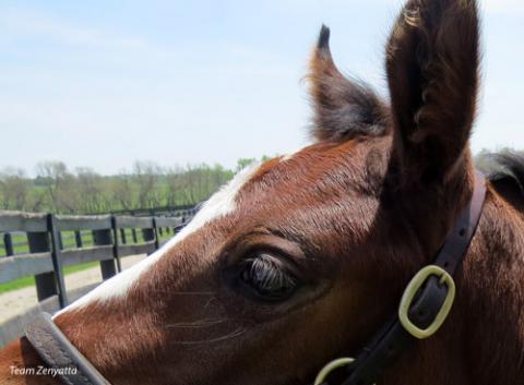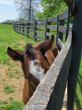 ZENYATTA'S FOAL LOOKS THROUGH THE FENCE