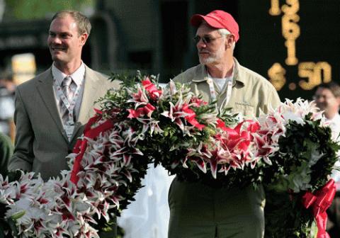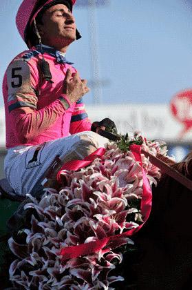 BLANKET OF LILIES DRAPED OVER 2010 WINNER BLIND LUCK AND RAFAEL BEJARANO