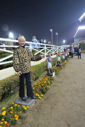 I thought about her several times after that and was in awe that she would travel from California to Arkansas on crutches, with that huge brace on her leg. I was positive we had crossed paths several times at Santa Anita Park. Our next encounter was at Del Mar. I caught a glimpse of her as I walked through the tunnel at Del Mar and discovered that she is a barber with her own shop behind the (now remodeled) Paddock Tavern. She was standing there chatting with jockey Mike Smith when I spun around to thank her for taking my photo. Her barber shop at Del Mar is a wonderful place to hang out. You never know who will next walk through the door. The walls are adorned with some of her photography, and it’s spectacular. She keeps a bowl of treats for her clients and of course peppermints for the horses.