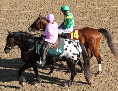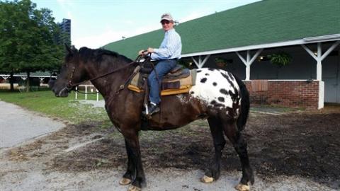 When she saddle broke him, he didn’t act up in any way. He didn’t fight her when she taught him to accept a bit and bridle. She used a ladder to mount him back then and still uses it. When pony rider Torrie Ann Needham rides him, she says it is “like sitting on a table.” Hall of Fame jockey Pat Day jumped on him one day last June and Harley took it all in stride. Day looked thrilled!