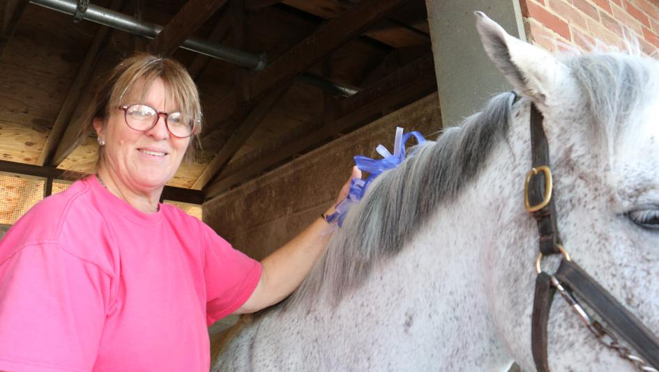 Most ponies do not mind the ribbons but sometimes they hesitate about having their tails decorated. Torrie said they will tuck their tails in and she has to coax them to relax and loosen up. She combs his forelock and mane and starts banding them into sections. He is wearing royal blue and white ribbons and will be the pony for Shagaf.