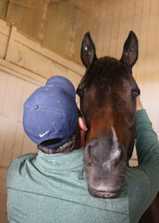 I watched him work with Satire the pony in the O’Neill barn. Satire is a wise old horse who is affectionately called “Coach” for how he handles the often high-strung youngsters on the track. The first thing Cerin does is to stop and stand calmly in front of the stall while talking to Coach. Coach is studying his hay and at first attempts to ignore Cerin. But Cerin is a smooth talker. It’s a quiet melodic conversation. Satire’s ears helicopter back and forth and then he gracefully moves towards the stall door and looks at Cerin. After some head and neck scratches, Satire nuzzles him with his head.