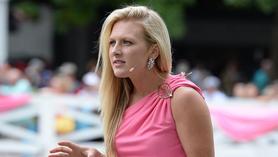 Maggie Wolfendale on air in the Saratoga paddock. (Adam Coglianese/NYRA)