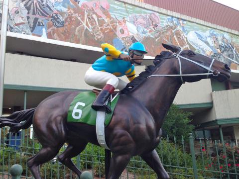 The main entrance to the track is a little further down Central Avenue. Here, my favorite feature is the horse and rider statue that is painted to match the most recent Arkansas Derby winner. And across the street from this entrance sits another good option for either pre-gaming or post-gaming: Crosswalk Bar and Grill.