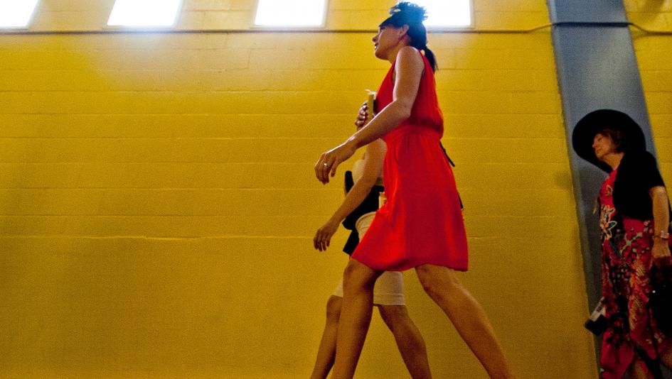 This simple yellow sheath dress, worn with a wide-brim red hat and delicate accessories, is so flawless, it’s worthy of a tribute to Faultless, the 1947 Preakness winner.
