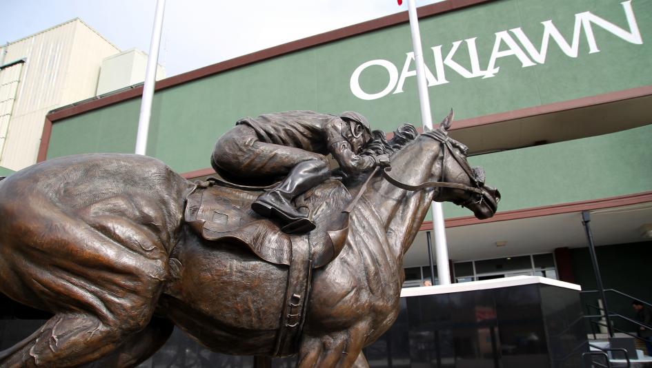 Unveiled the day before the opening of the 2018 meet, this life-sized bronze statue by artist James Peniston greets fans at the redesigned entrance to Oaklawn’s grandstand.