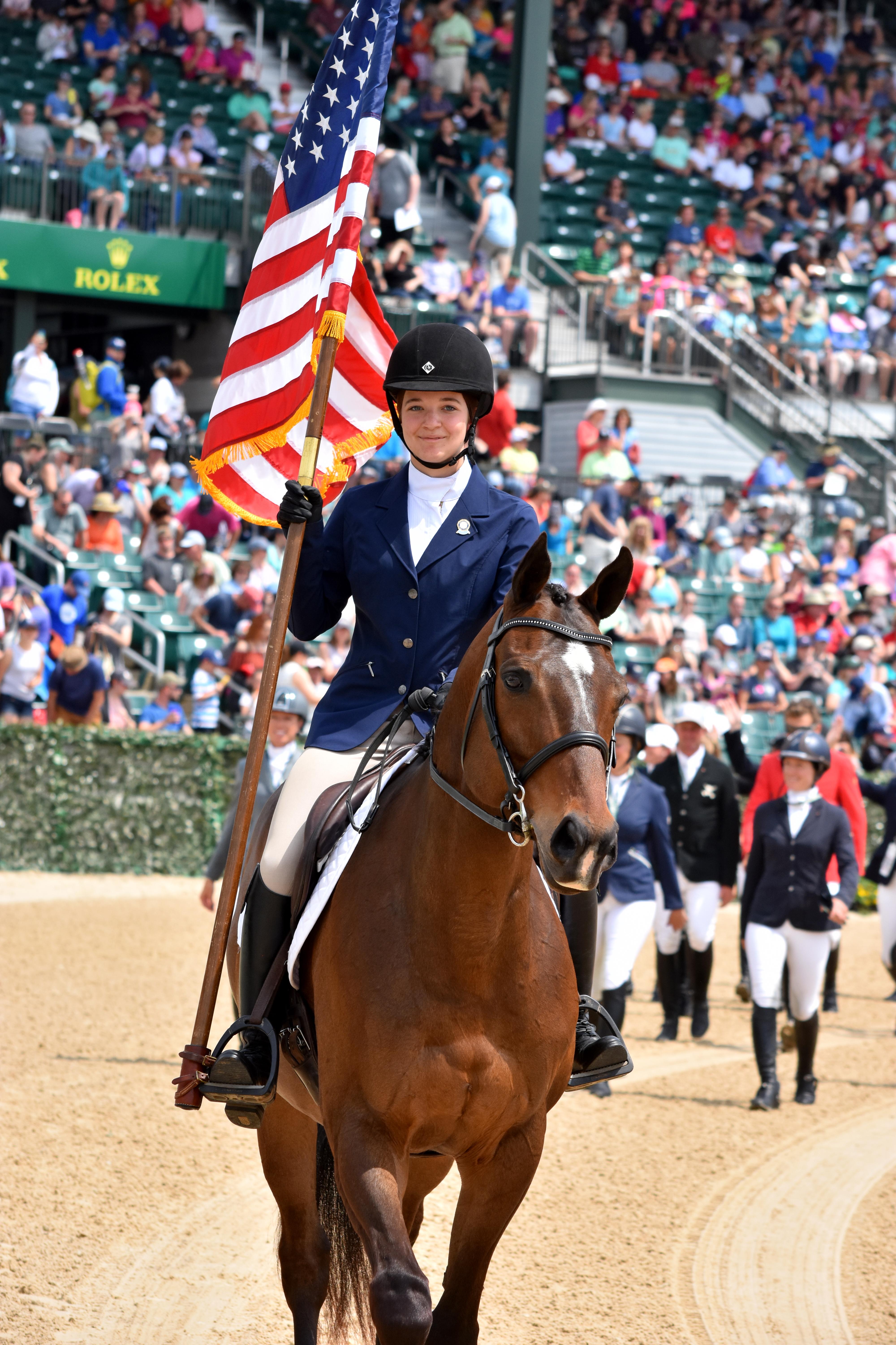 “The young lady that was riding him was quite a capable rider and would fit him well. Within an hour we had him bathed, braided, and at the Kentucky Horse Park to meet his rider Keely Bechtol,” said Fedorka. “Like any true Pony Clubber, she took everything in stride. We had her on him to get her comfortable with him within minutes of meeting him, had her desensitize him to the flag in only a few more, and then they were off to the Rolex Arena for their big moment. He had never carried a flag, he had never been in that large of an arena, and he had never heard a standing ovation of tens of thousands of people, but he took it all in stride. It was one of my proudest moments as a horse ‘mom,’ and all he did was walk.”