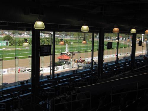 There is not a bad seat in the house. You won’t be too far past the finish line nor so close to the final turn you can’t see the finish. The large screen in the infield helps too. The overall space is small enough to cover with ease but large enough to spread out with many little niches and tucked away bars if you prefer more privacy. The paddock may be the best part though. Its compactness guarantees an up close and personal experience. There are vantage points on the second and third floors. The latter is inside only but the former offers indoor and outdoor perspectives. Of course, there’s ground level too and you can get very close indeed. Plus the Star Guitar Bar is right there, so you can keep the party going while handicapping.
