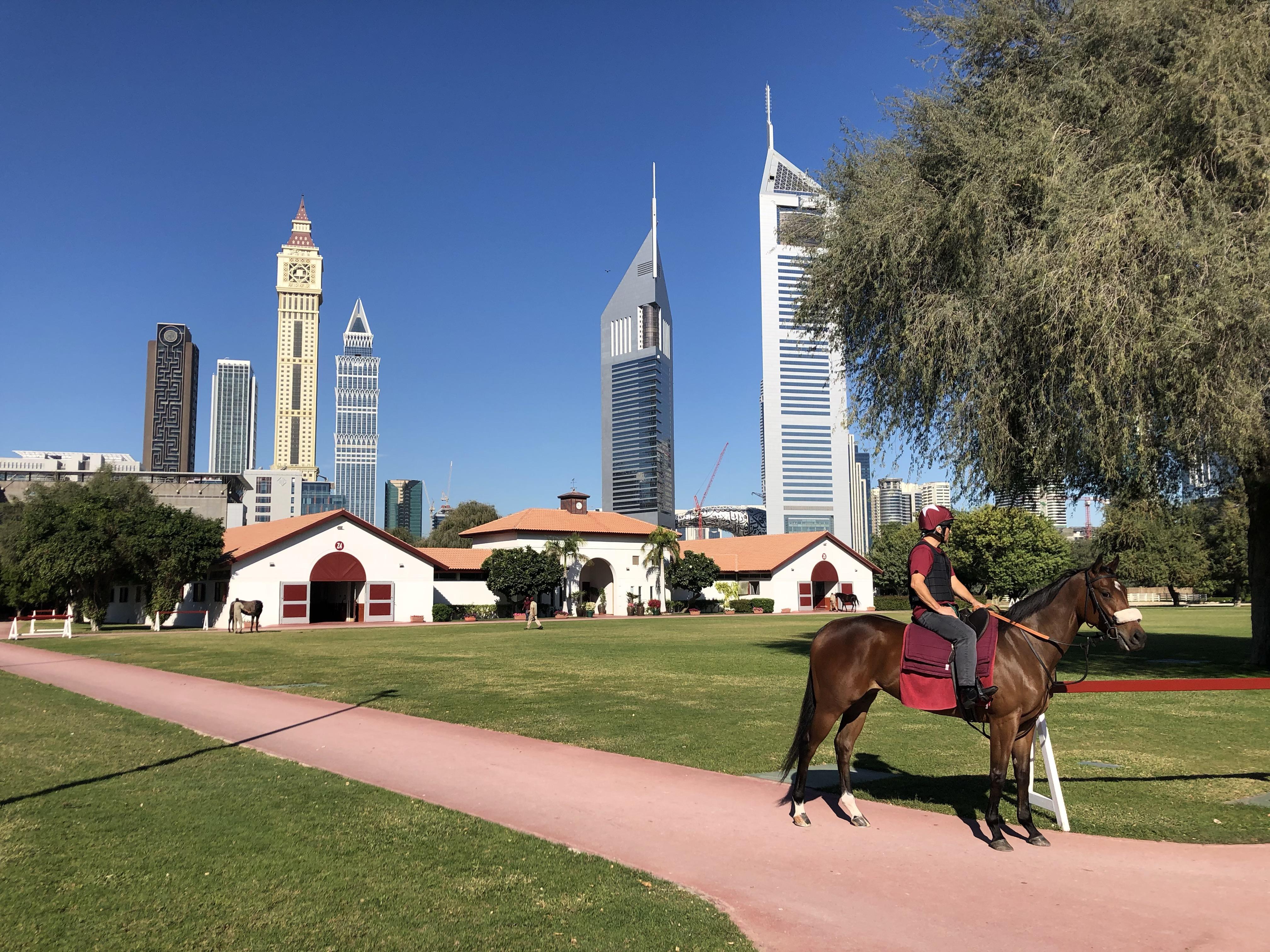 Stable lads led sleek Thoroughbreds down paved pathways and alongside a long, crystal blue equine swimming pool. One groom untacked a horse on the bright green lawn. The natural beauty of the horses and humming energy of morning training was a magnificent juxtaposition against the Dubai skyline. Black, silver and gold sparkling towers pierced the sky, disguising the desert they’ve grown out of. It was one of those moments where your stomach flutters and you wonder to yourself – “How did I get here?”