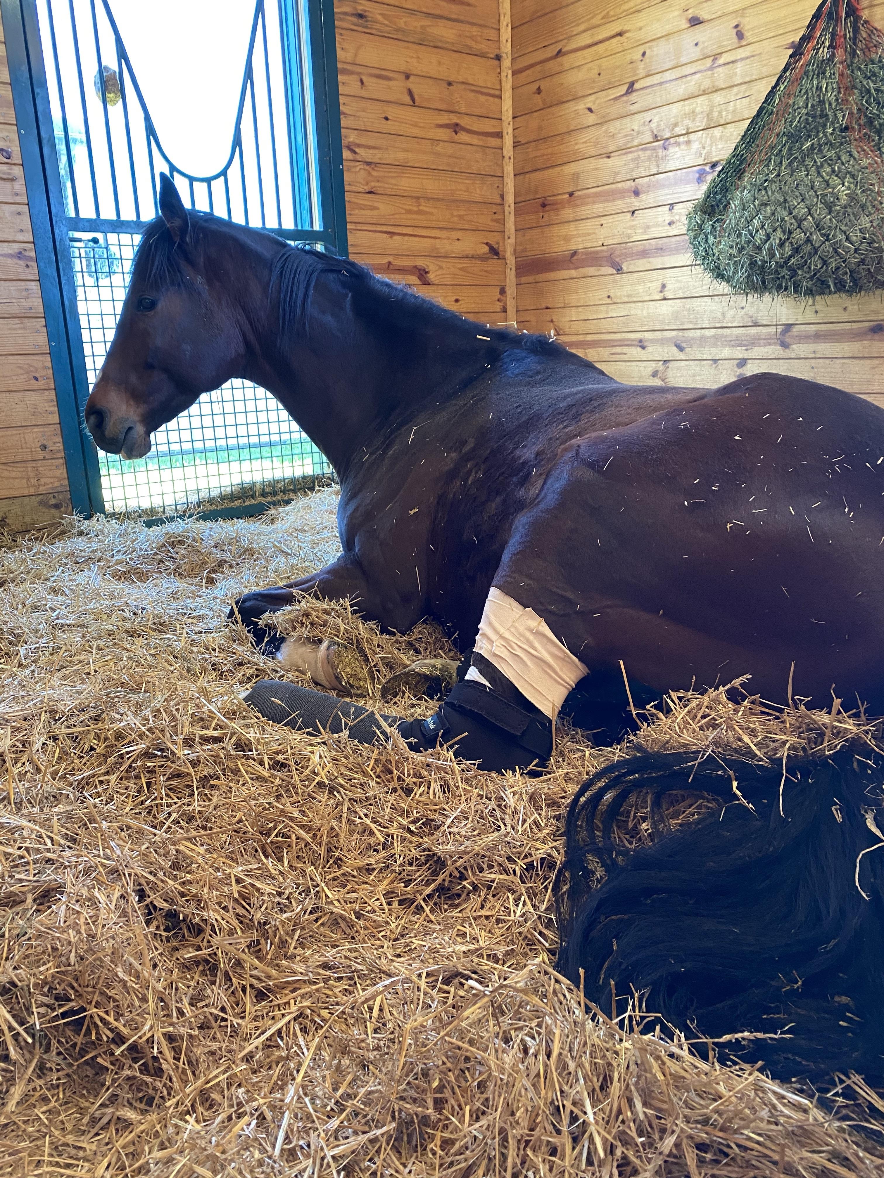 I have an amazing vet that wants to help the horse above all else. I asked him at the beginning if it was even worth trying. I have dealt with serious injuries in other horses, but never with one of my own, so this all felt like uncharted territory and thought of putting the horse through all of this with an uncertain outcome scared the heck out of me. He told me of similar injuries that had good outcomes so we agreed to try. He answers my text messages with a phone call, he is always available to listen to my stupid questions, and he doesn’t think I’m crazy when I suggest something off the wall, like the time I thought wrapping a placenta around the horse’s leg would act as a stem cell treatment. And I can’t forget that I also have so many friends from the Retired Racehorse Project, and in general, that have reached out, sent messages and cards, have let me borrow random things, and have just offered advice. Plus, I never really knew how many fans Term of Art had until this happened and another positive to come out of this not so great situation is that I have met so many new people that share my love for him.