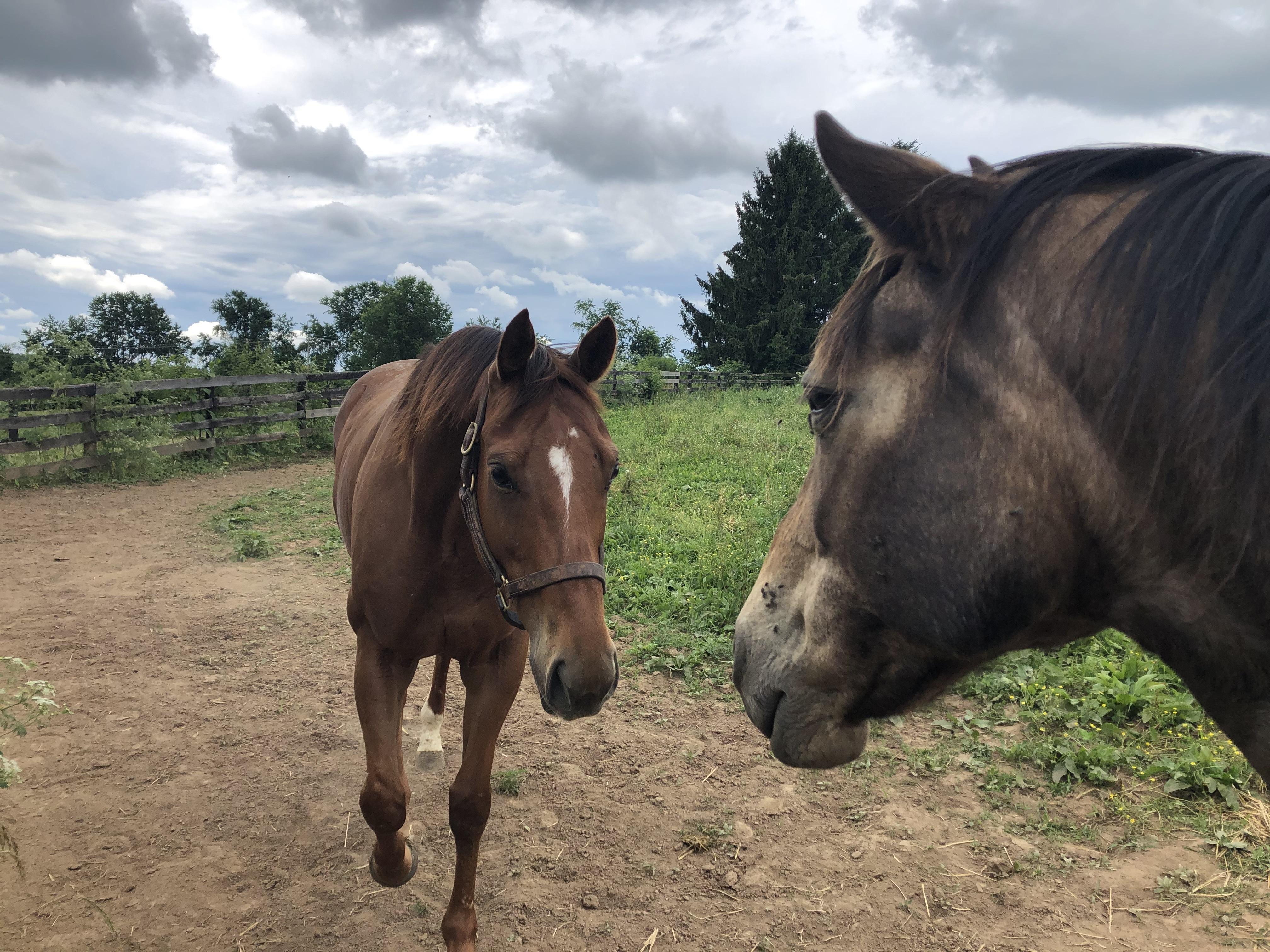 To make the transition to small paddock turnout, we knew we would have to be strategic. Enter Oliver. Owned by a friend, Oliver is a sweet, mellow “mutt” of a horse, who has been there and done that. He’s a calm old man now, enjoying quiet rides and life outside. He cannot be baited into play or shenanigans, making him the perfect influence for Phantom. Armed with sedation and a babysitter, we were ready to turn Phantom out.
