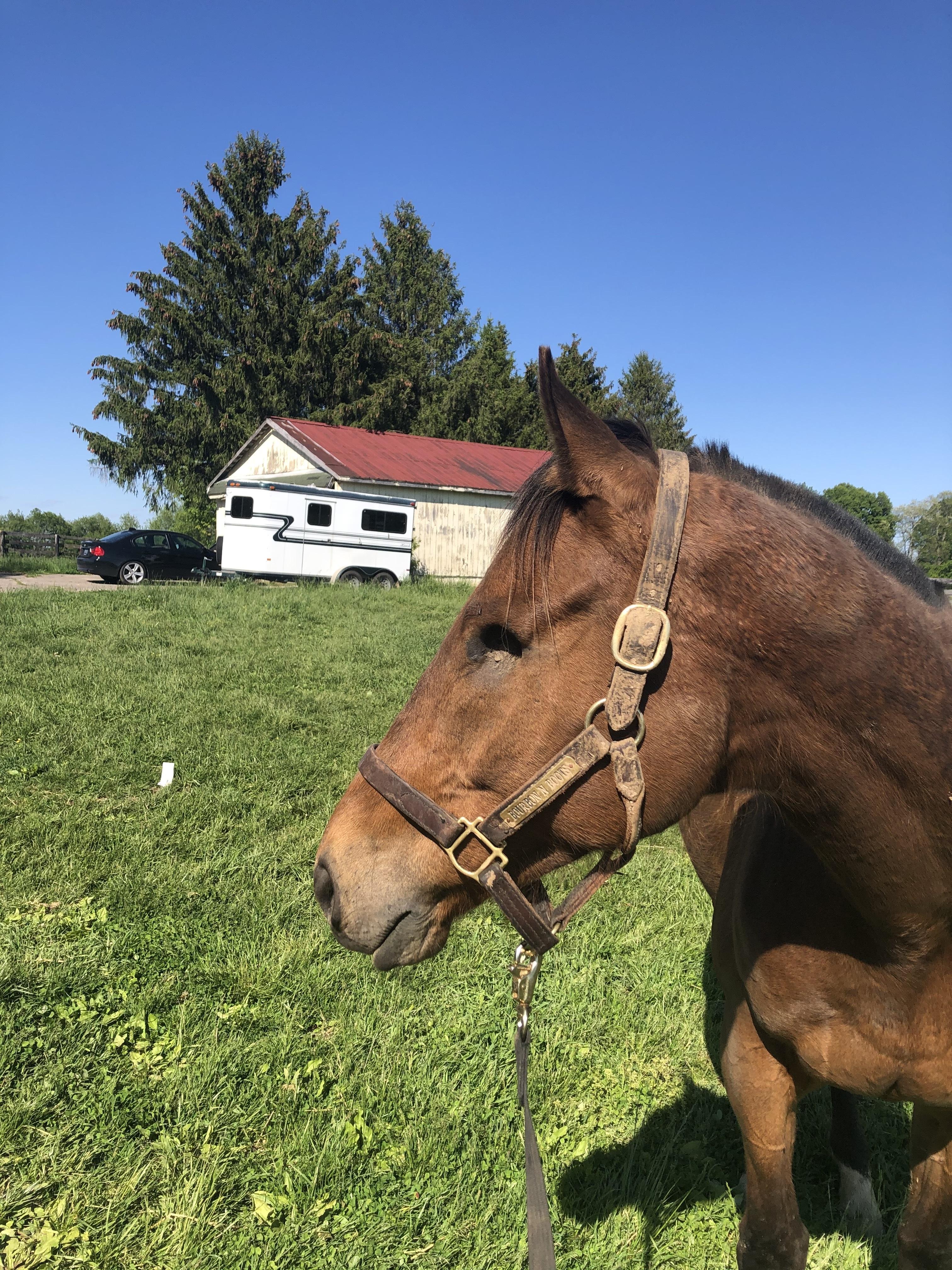 Methuselah has a sweet personality, and learns new things quickly. We have worked on lunging and ground manners, as well as trotting over poles. Though he was initially hesitant to step over the poles, he figured it out very quickly and never looked back. Our lunging progress has been an interesting journey, and has led to me needing to be more creative as a trainer. When his eye is on the inside of the circle, he is able to perceive direction normally. Despite not being able to see what is to the outside, he does not spook, and maintains focus. Upon switching directions, he can no longer see me, and all visual cues are useless. We are working on verbal cues to help with this, and he has been doing well in hand. Methuselah is a personable, goofy horse; it has been fun to learn his personality while helping him navigate his new life as a riding horse.