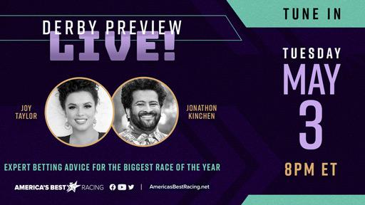 America’s Best Racing is the go-to destination for livestreaming content all through Derby week. First up, Joy Taylor hosts “Derby Preview LIVE!” Tuesday, May 3 at 8 p.m. ET. The show features handicapping from Jonathan Kinchen and will air on ABR’s Facebook, Twitter, and YouTube channels as well as on Joy’s Twitter channel and Jonathan’s Twitter channel.