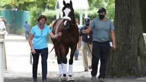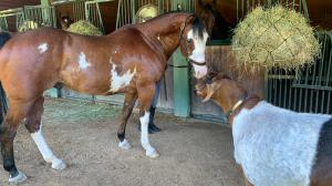Gilbert walks purposely down the shedrow, surveying a stranger approaching the barn where he resides in Saratoga Springs, N.Y. The brown and white goat’s leather collar has a name plate reading “Gilbert Atras,” indicating his association with trainer Rob Atras and his wife and assistant Brittney.