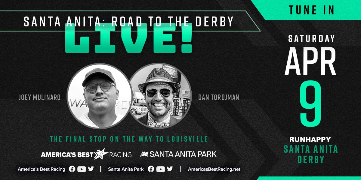 A highlight of livestreaming broadcasts for Derby prep week is ABR’s “Santa Anita: Road to the Derby LIVE!” show Saturday, April 9 beginning at 4:30 p.m. ET. Hosts Joey Mulinaro and Dan Tordjman anchor this special Runhappy Santa Anita Derby edition of “Road to the Derby LIVE!” directly from Santa Anita Park. They'll be joined by surprise guests and handicappers and have live analysis right up until post time for the big race.