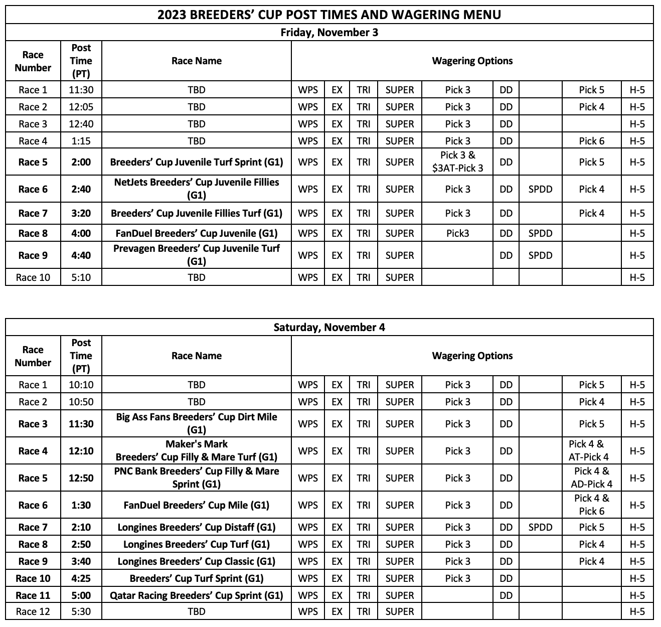 Breeders’ Cup Limited revealed Oct. 25 the official order of races and post times for the 2023 Breeders’ Cup World Championships as well as an expanded betting menu for the two-day event scheduled for Friday, Nov. 3 and Saturday, Nov. 4 at Santa Anita Park in Arcadia, Calif.