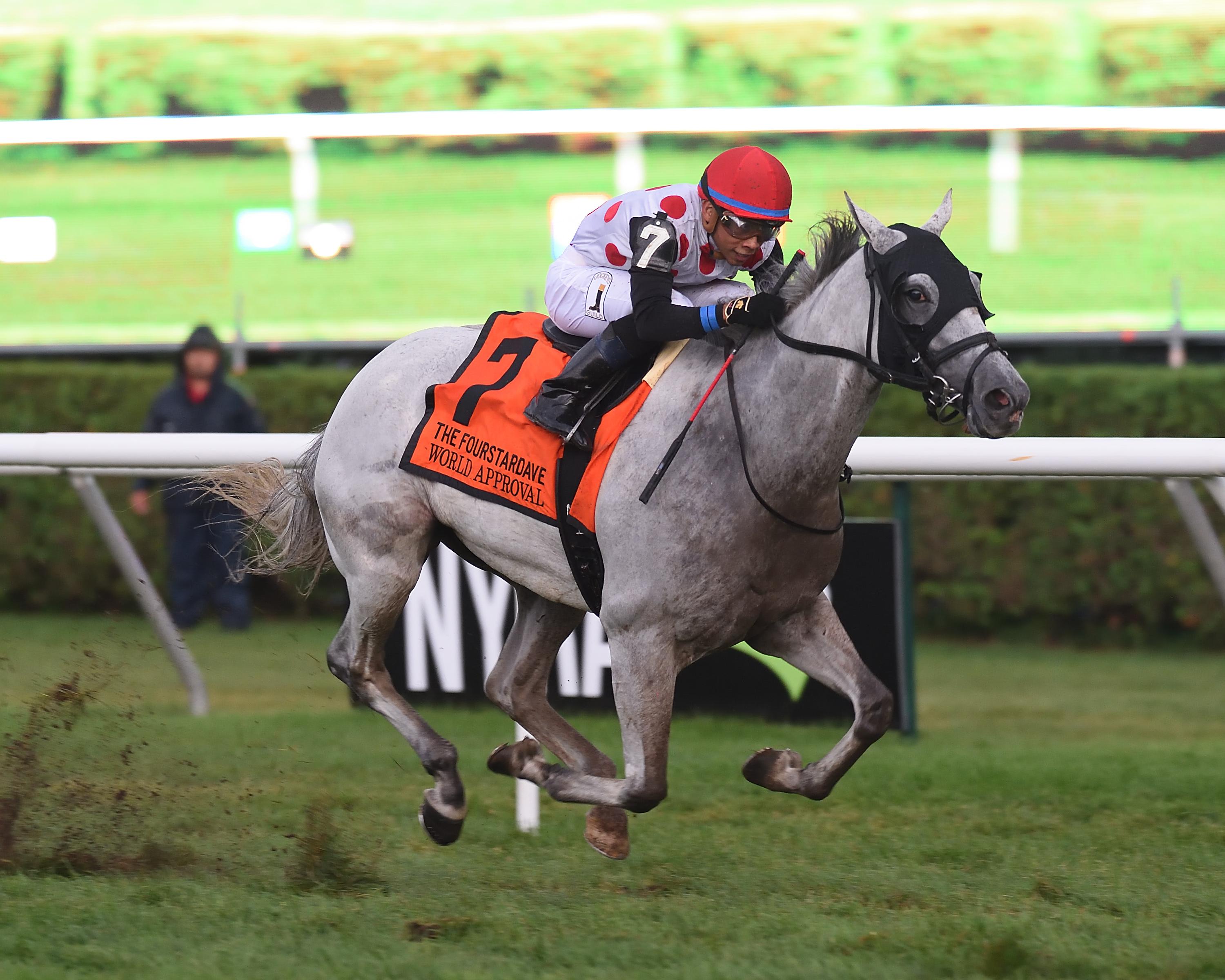 He caught a rare break during a meet in which he has been seemingly star-crossed when the thunderstorms passed. World Approval did the rest on a yielding surface, repelling favored Time Test by 2 ¼ lengths on Saturday in the $500,000, Grade 1 Fourstardave Handicap.