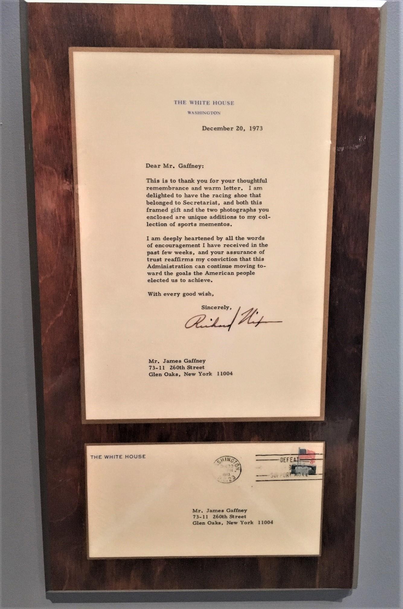 Later that year, President Richard Nixon himself would be given a shoe of the champion. Following Secretariat's victory in the 1973 Triple Crown, two of the shoes worn by Secretariat on Nov. 18, 1972, in the richest 2-year-old stakes at the time, the Garden State Stakes, were mounted and framed by Secretariat's exercise rider, Jim Gaffney. Gaffney presented then-President Richard Nixon, a big sports fan, with one of the shoes and Nixon wrote back to Gaffney on official White House letterhead, thanking Gaffney for the unique addition to his collection of mementos.