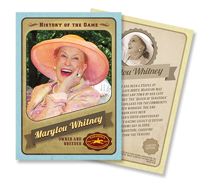 Marylou Whitney first came to Saratoga in 1958, when she married Sonny Whitney, a scion of the famed and fabulously wealthy Whitney and Vanderbilt families, and took up residence in their Cady Hill mansion. In the ensuing 61 years, what she gave Saratoga was a gift that can never be repaid. When others were deserting Saratoga in the late 1960s and early 1970s, she worked tirelessly in the public spotlight and behind the scenes to foster a new attitude about the town and its racetrack.