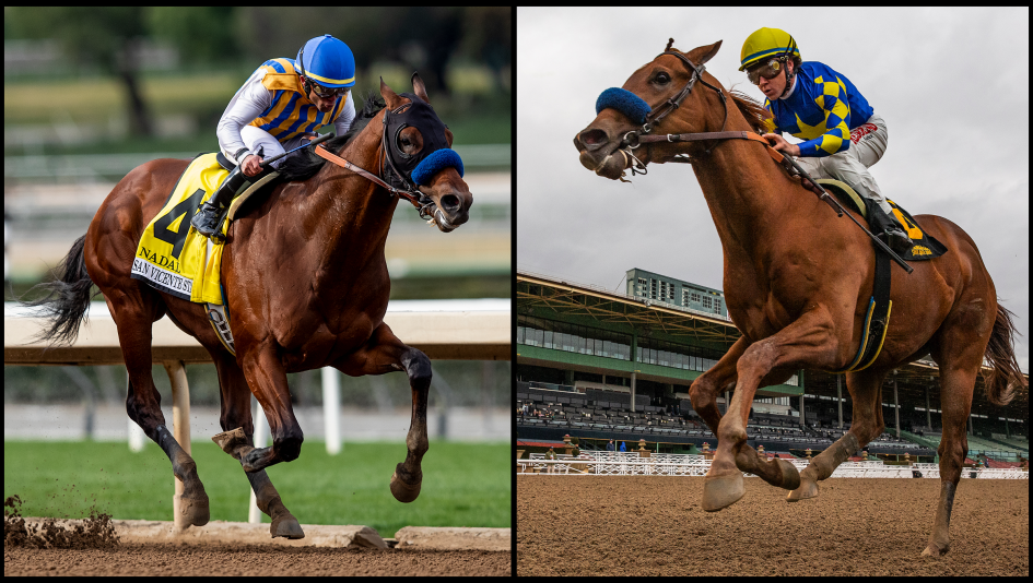 Nadal (left) and Charlatan, both trained by Bob Baffert, are the morning-line favorites in respective divisions of Saturday’s Arkansas Derby at Oaklawn Park. (Eclipse Sportswire)