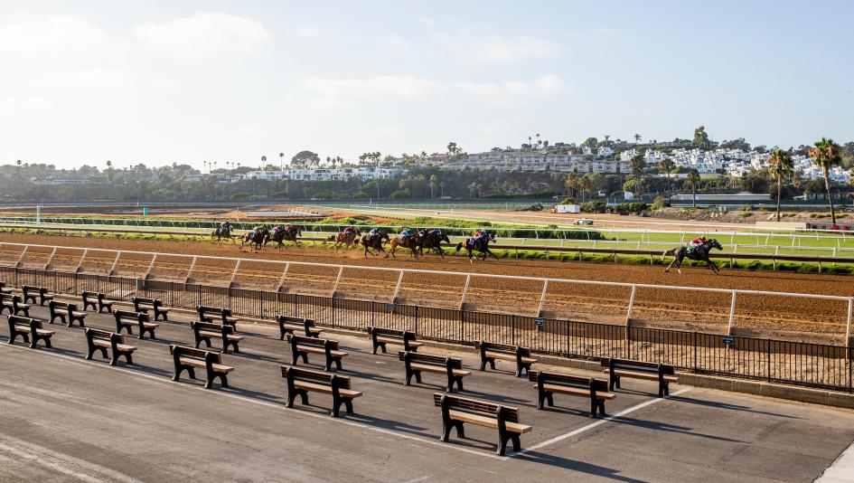 Horses race through the stretch at Del Mar during the 2020 summer meet. (Eclipse Sportswire)