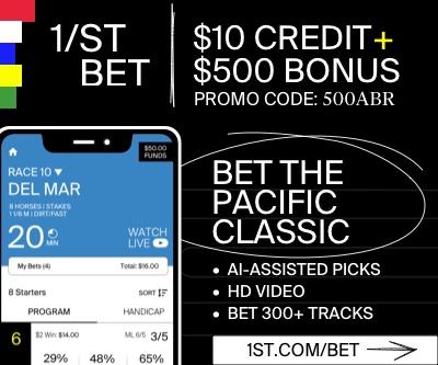 Bet the Pacific Class this Saturday with 1/ST BET and get a $10 Instant Credit + Up to a $500 Bonus when you sign up with promo code 500ABR. When you handicap, bet and watch the Pacific Classic on 1/ST BET, be sure to take advantage of our Risk-Free Bet and 10% Exacta Bonuses. Bet your horse to Win in the Pacific Classic, Race 10, and get your cash back, up to $10, if you lose. Simple as that. Plus, we're offering a 10% Bonus on all winning Exacta bets for the entire Del Mar card. Between that, our free AI Handicapping, and expert picks, your best bet on the race is at 1/ST BET. So sign up with Promo Code 500ABR and wager now!