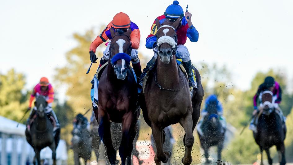 Swiss Skydiver (right) outfinished Authentic to win the Preakness Stakes on Oct. 3 at Pimlico Race Course. (Eclipse Sportswire)