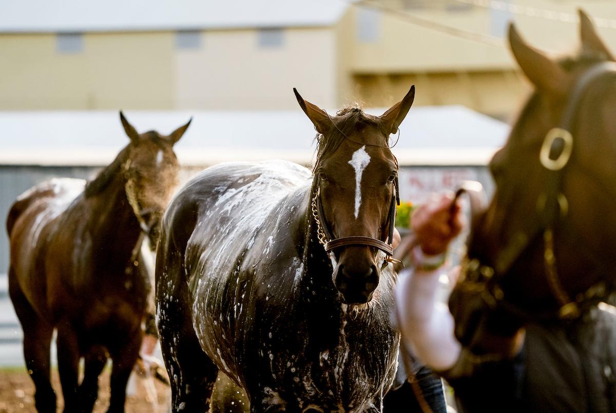 Midnight Bourbon getting a bath at Pimlico. (Eclipse Sportswire)