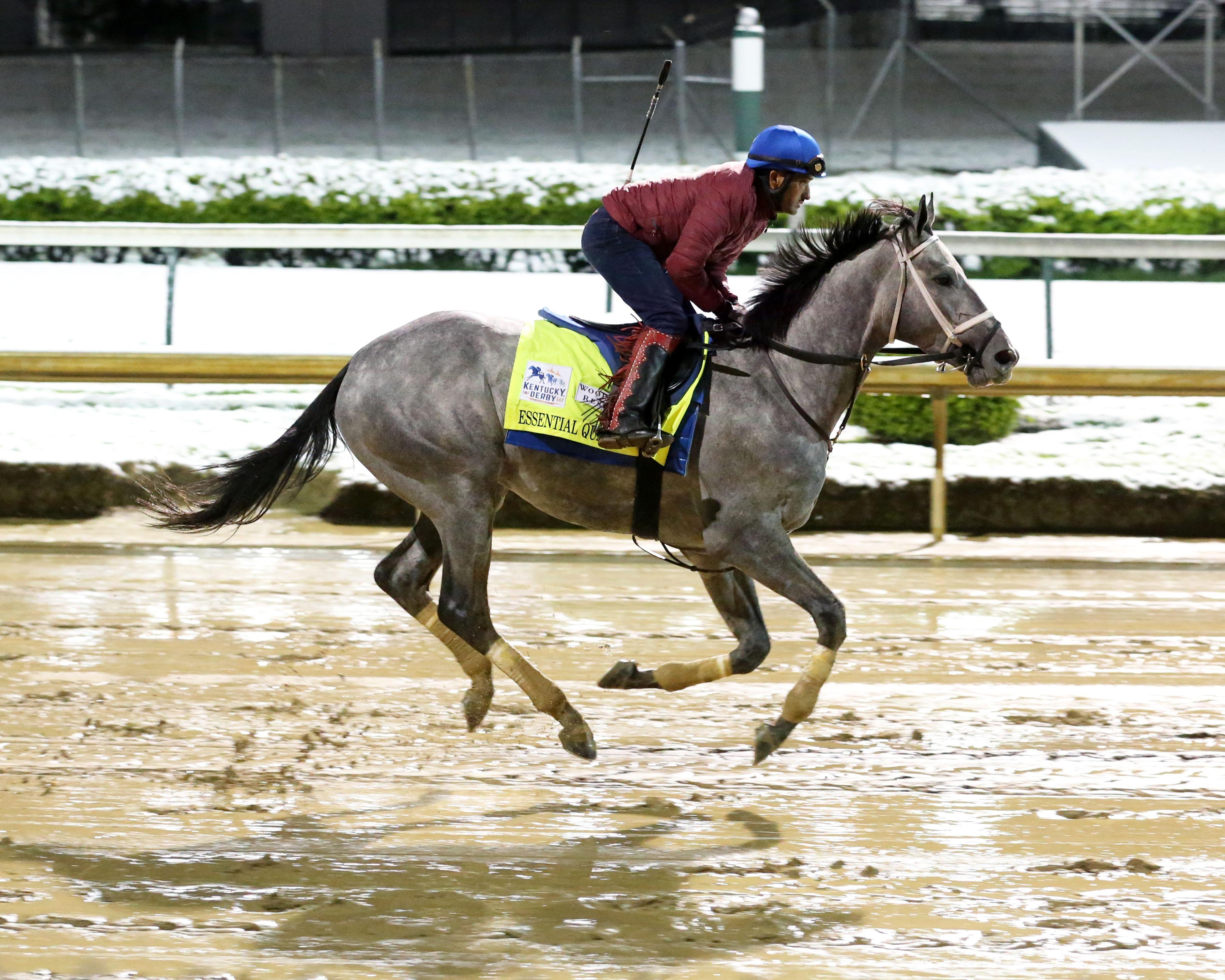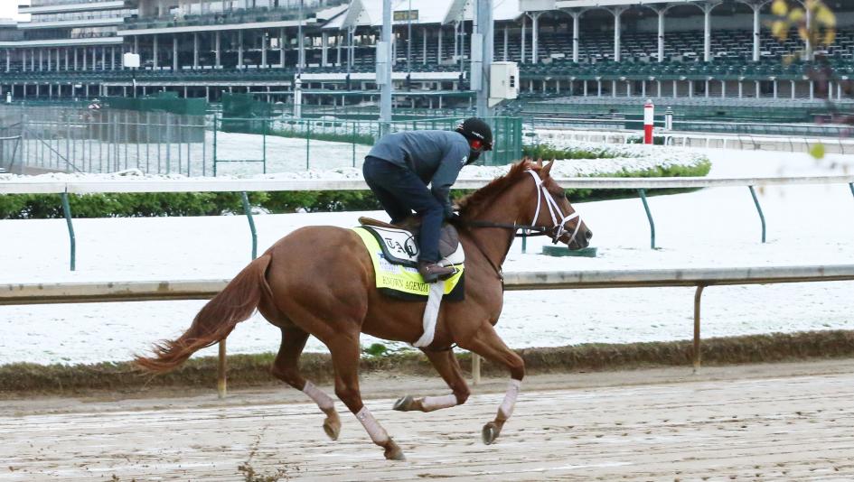 Kentucky Derby contender Known Agenda trains on Churchill Downs’ main track April 21 after a rare snowfall the evening before blanketed the Louisville area. (Coady Photography)