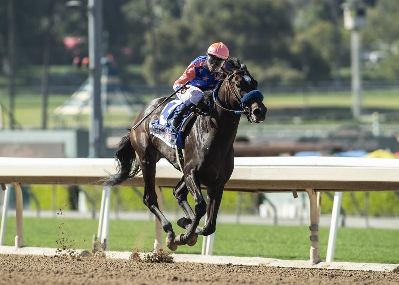 After being hustled to the lead from post 2 in the Runhappy Santa Anita Derby, he successfully transitioned from dirt after scoring twice earlier on turf. He set a strong pace, timed in :46.11 for a half-mile and 1:10.64 for six furlongs, and drew away by 4 ¼ lengths to stop the clock in 1:49.17. Horses with grass form that won the Derby this century include Barbaro and Animal Kingdom.