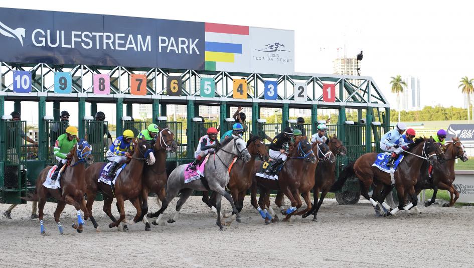 The field for the 2021 Florida Derby leaves the starting gate at Gulfstream Park on March 27. (Lauren King/Coglianese Photo)