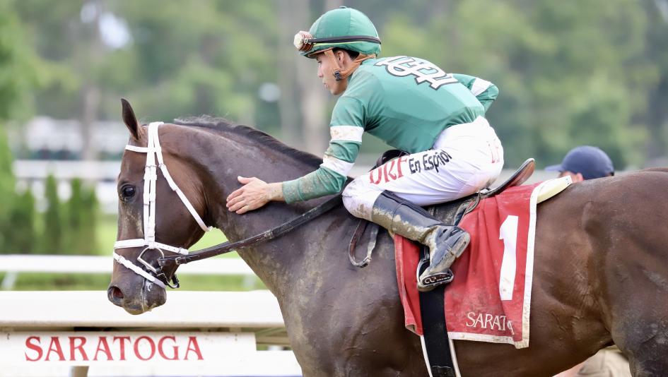 The starting gate troubles cropped up again for Wit’s second start in the $150,000 Sanford Stakes, a three-quarter-mile Grade 3 race on July 17 at Saratoga Race Course, but they were caused by the runner to his outside immediately crowding him. Starting from the inside post, Wit recovered quickly and moved up to stalk the pace from fifth, 5 ½ lengths behind pacesetter Trust Our Journey.