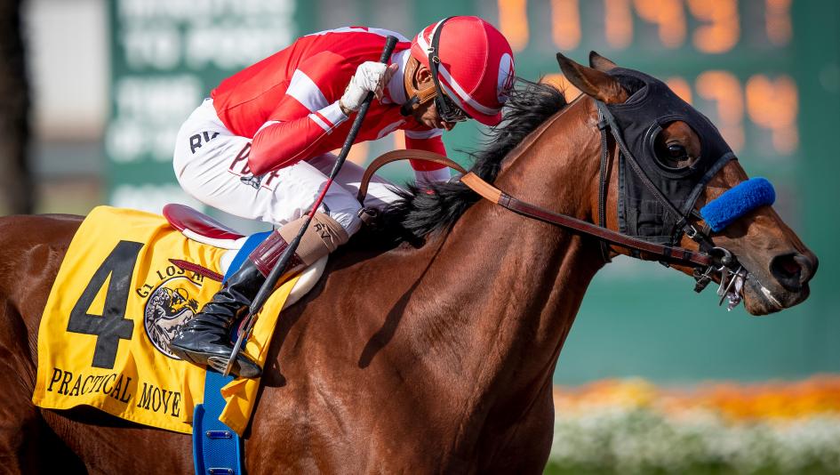 Stretching out in distance to 1 1/16 miles for the Los Alamitos Futurity, Practical Move delivered a career-best effort to prevail by 3 ¼ lengths. He tracked a solid pace of :46.66 through a half-mile from just in behind Carmel Road, rallied through an opening on the inside, and pulled well clear with a final sixteenth of a mile in 6.56 seconds.