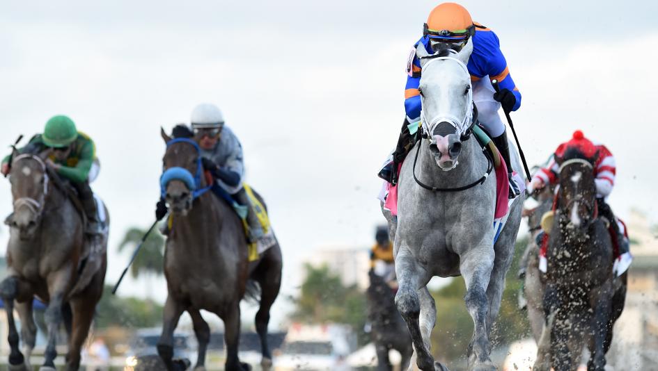 White Abarrio won the Holy Bull Stakes on Feb. 5 at Gulfstream Park. The colt is currently ranked seventh on NTRA’s poll of top 3-year-old Thoroughbreds. (Bob Coglianese/Gulfstream Park)
